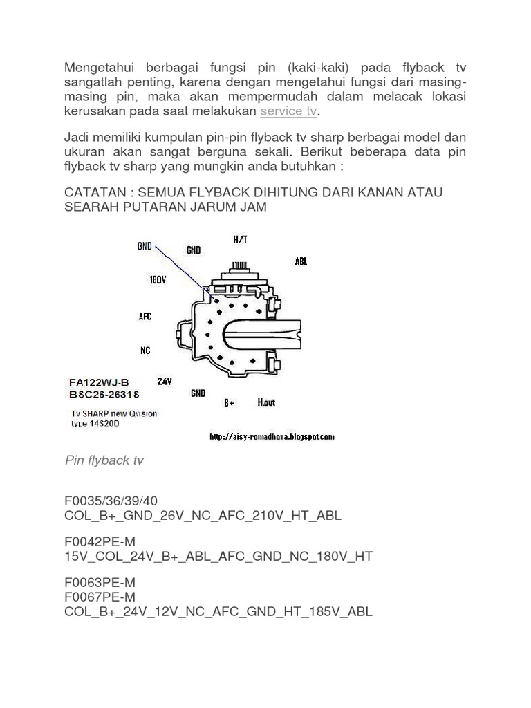 Flyback seperti ini bisa dipakai meskipun nomor type tidak sama. 3.tegangan reset (pin3 ic ka7045, kaki3, dekat ic program) minimal 4,5v. Belajar elektronika bersama teknik listrik smkn 1 krangkeng home profil o o o komponen o o o o o o menu 3 o o o o perkakas flyback tv minggu, 23 oktober 2011 blok tv blok tv system televisi berwarna menggunakan tiga sinyal untuk bekerja secara sempurna, tiga sinyal tersebut adalah : Col (h.out / colector transistor horizontal) Transistor tv tabung/crt ,persamaan transistor md 1803 dfx, md1803dfh atau md1803dfp dengan spek kemampuan arus sama bu2520dx 1500v 800v 10a 45w damper md2009dfx 1500v 700v 10a 58w damper c6090 1500v 700v 10a 35w no damper bu2520ax 1500v 800v 10a 45w no damper md1802fx 1500v 700v 10a 57w no damper d2581 1500v 800v 10a 70w no damper d2646 1500 700v 10a 80w no damper d5703 1500 800v 10a 70w no. Col _ b+ _ 185v _ gnd _ nc _ 24v _ 12v _ abl _ ht _ afc flyback : Col _ b+115v _ gnd _ 24v _ 16v _ afc _ 180v _ gnd _ ht _ abl. Col _ b+115v _ gnd _ 40v _ 16v _ afc _ 180v _ gnd _ ht _ abl tv sharp model 51v200 flyback : This is all pinout about this products , and their numbers. 1.tegangan b+ 115v harus 115v pada 20 dan 21 dan 113v pada 14. Col _ b+130v _ gnd _ 24v _ 12v _ afc _ 180v _ gnd _ ht _ abl susunan dan keterangan data pin : Syarat agar tv bisa nyala atau start. Fbt is a high current transformer, used in old tvs and monitor.